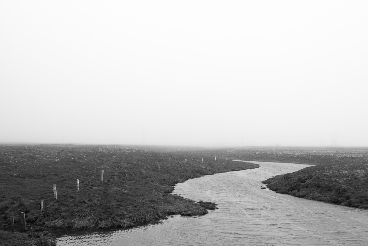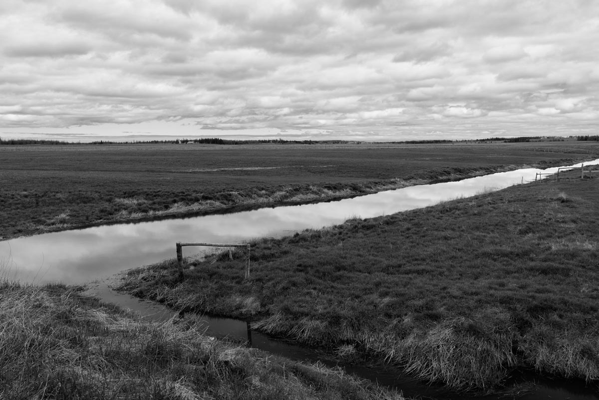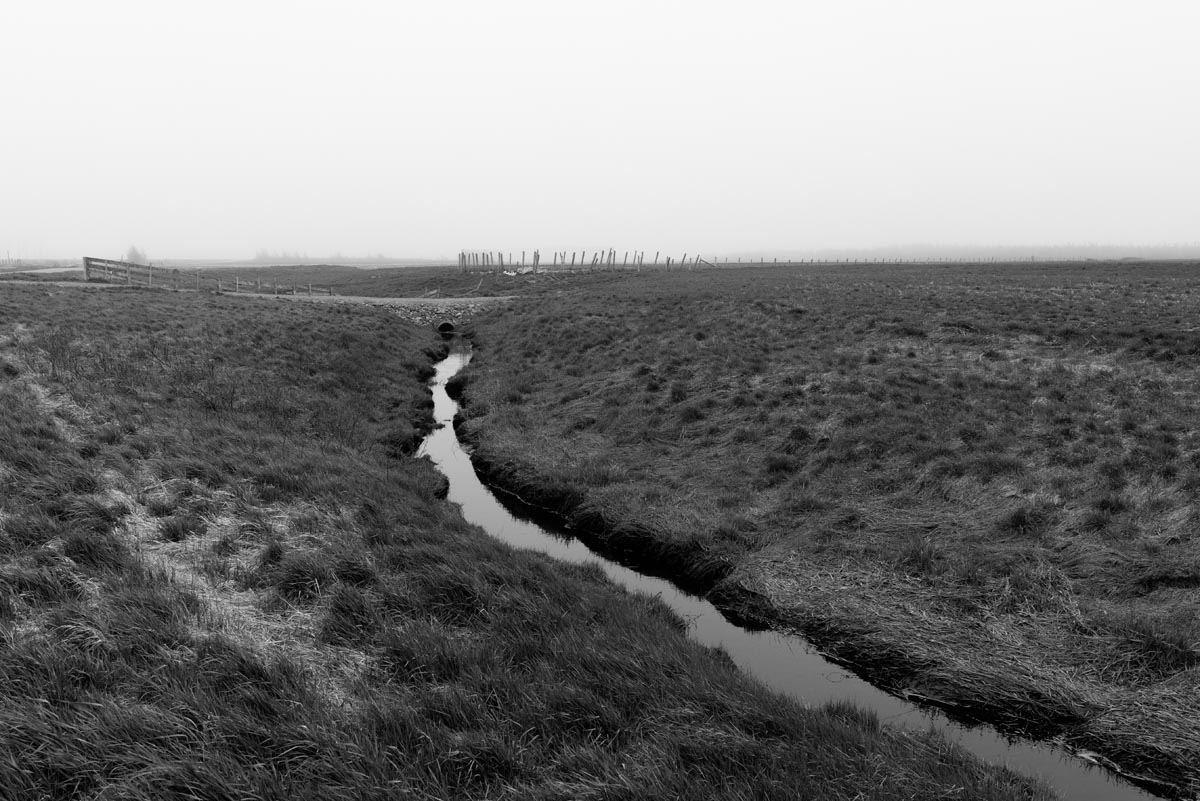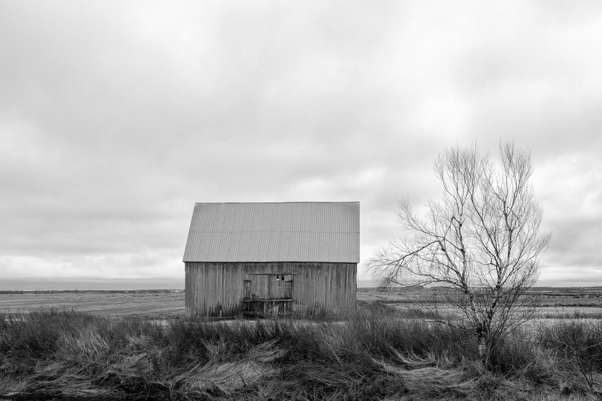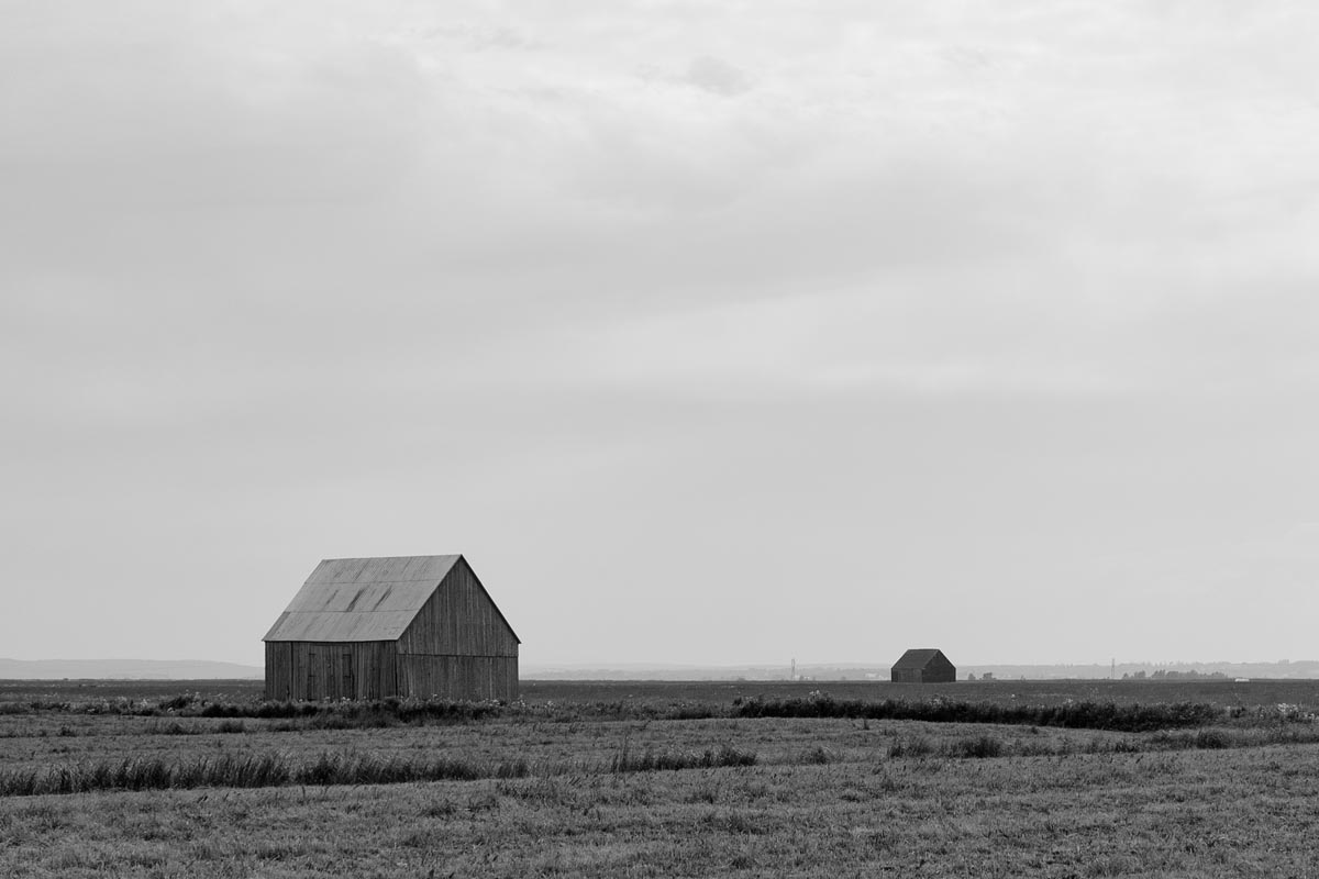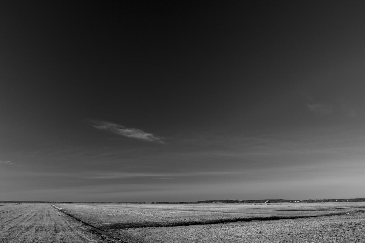 While many photographers visit for the remaining hay barns, the covered bridge, or to capture glimpses of both resident and migratory birds, my focus is usually on the land itself. I look for shapes and patterns created by the roads, tractor paths, swales, and berms, either naturally or through contrast. More often than not, I will turn my camera more to the sky, eschewing the rule-of-thirds and working with a sliver of land forming only one-fifth or one-sixth of the image. As David Plowden has stated, when there is not much to see on the land, the sky becomes the greater part of the equation. Clear skies seem to be a rarity, so the clouds are sometimes the main subject.