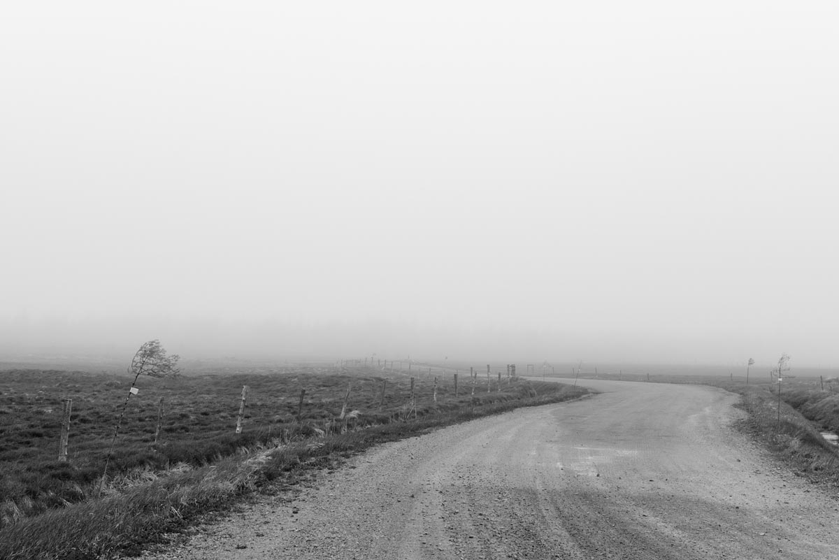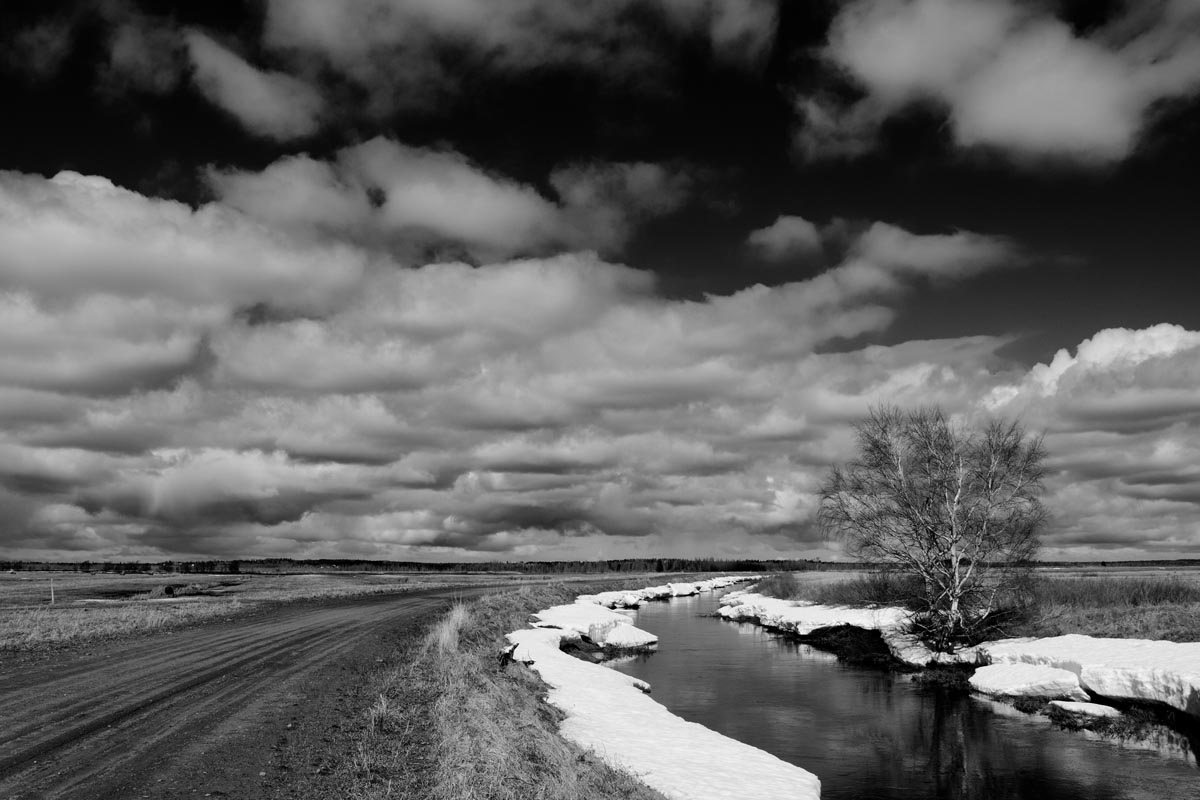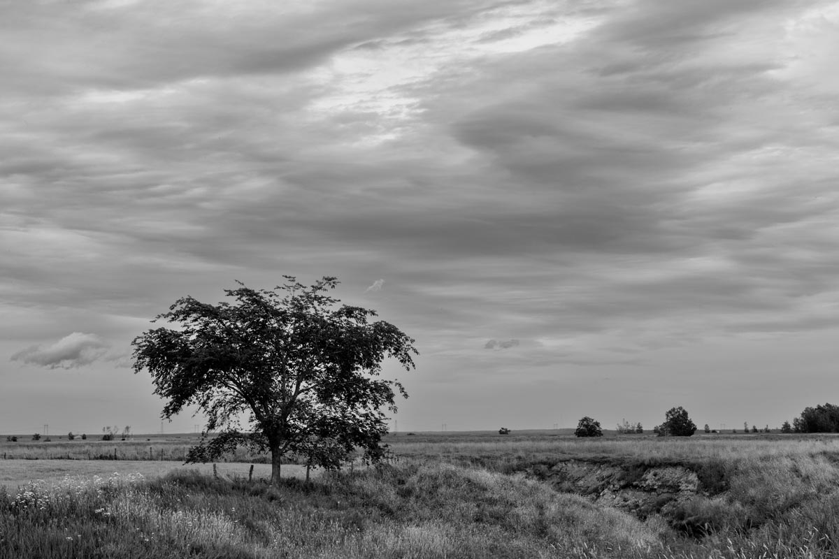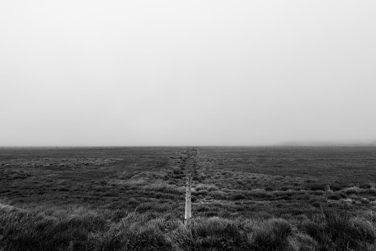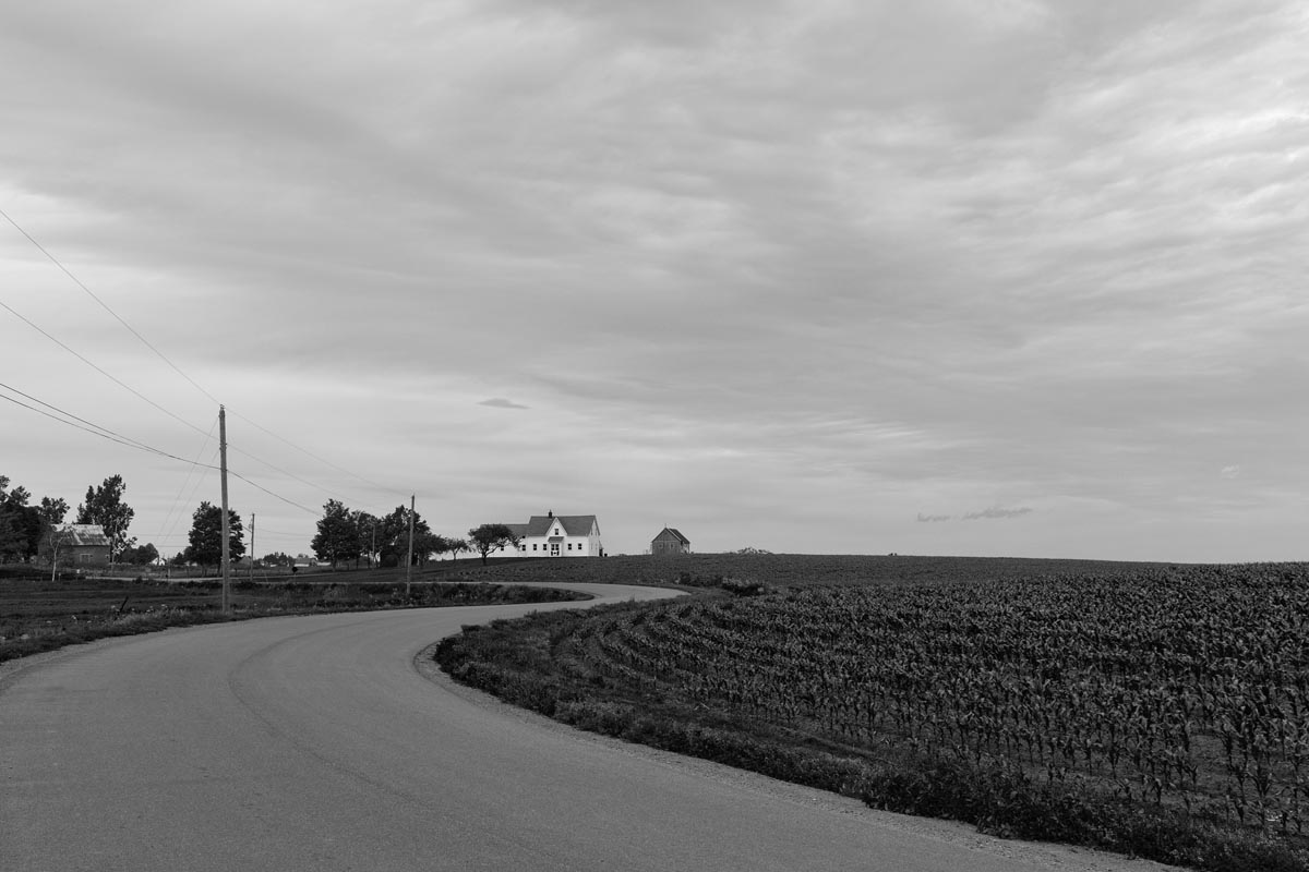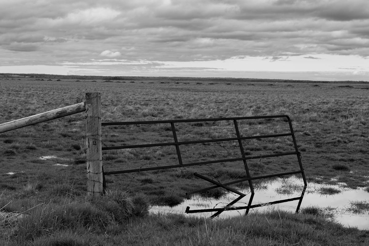 While many photographers visit for the remaining hay barns, the covered bridge, or to capture glimpses of both resident and migratory birds, my focus is usually on the land itself. I look for shapes and patterns created by the roads, tractor paths, swales, and berms, either naturally or through contrast. More often than not, I will turn my camera more to the sky, eschewing the rule-of-thirds and working with a sliver of land forming only one-fifth or one-sixth of the image. As David Plowden has stated, when there is not much to see on the land, the sky becomes the greater part of the equation. Clear skies seem to be a rarity, so the clouds are sometimes the main subject.